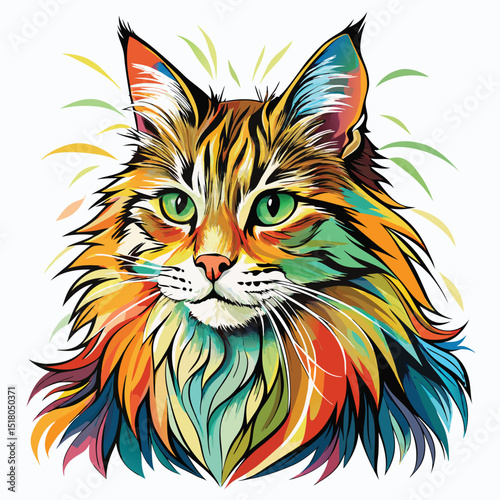 Colorful Maine Coon Cat Illustration with Green Eyes and Artistic Flair Painting