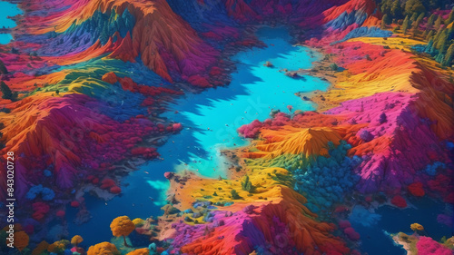 Colorful Majesty: Aerial View of Vibrant Wonderland, Kaleidoscopic Landscapes, Generative AI