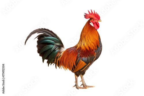 Colorful male rooster displaying rich orange neck feathers and iridescent green-black tail plumage, isolated on a transparent background