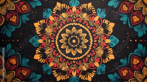 Colorful Mandala Art Design, Dark Background, Symmetrical, Digital Illustration, Website Decor