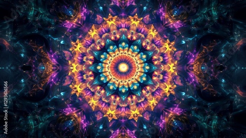 Colorful mandala with intricate patterns and vibrant colors forming a radial symmetry against a dark background. Spiritual and meditation art concept.