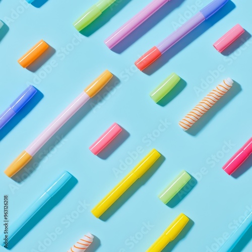 Colorful Markers on Blue Background - Overhead View Editorial Photography