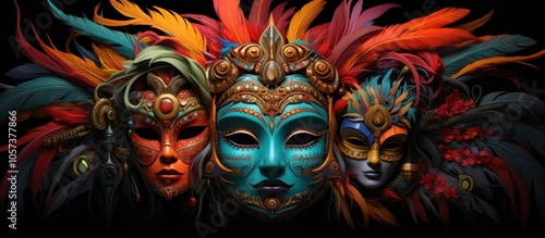 Colorful masks adorned with feathers, showcasing vibrant cultural artistry and celebration.