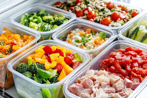 Colorful meal prep containers filled with fresh vegetables and proteins for healthy eating.
