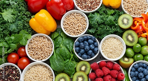 Colorful Meal Prep Station With Fruits, Vegetables, and Grains Supporting a Healthy Lifestyle