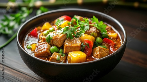 Colorful Meat and Vegetable Stew in Black Bowl on Wooden Table
