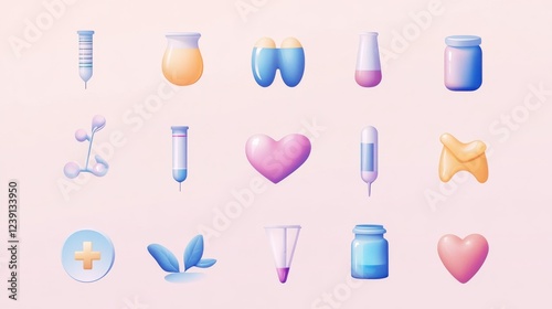 Colorful medical icons collection featuring syringe, heart, and test tube designs on soft background