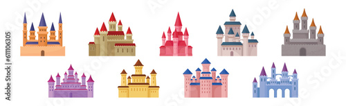 Colorful Medieval Castle with Stone Wall and Tall Towers Vector Set