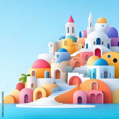 Colorful Mediterranean architecture features domed rooftops, stairways, and vibrant hues against a clear blue sky.