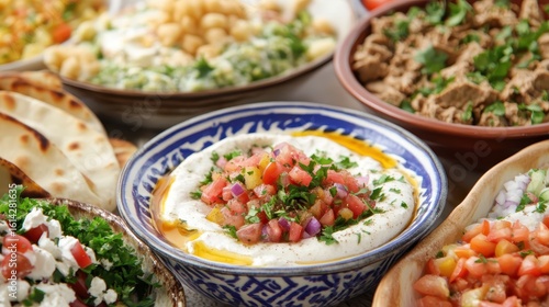 Colorful Mediterranean Platter with Dips, Salads, and Fresh Ingredients
