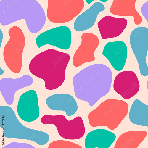 Colorful messy abstract seamless pattern with uneven round stains, spots, geometrical shapes on pink background. Vector illustration.