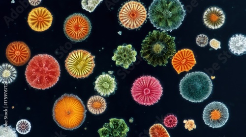 Colorful microscopic diatom colony floating on dark background, radial silica frustule pattern and delicate texture, scientific close up with vibrant orange red green and yellow hues