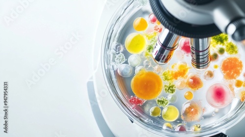 Colorful microscopic view showcasing vibrant microorganisms in a petri dish. A perfect representation of scientific exploration and discovery. Ideal for educational and research purposes. AI