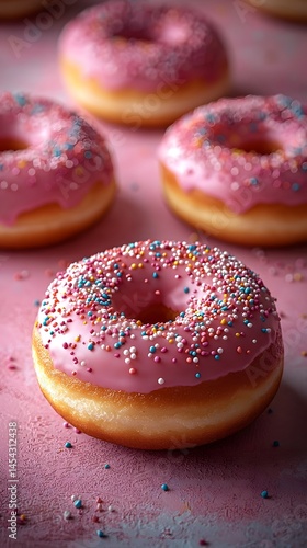 Colorful mini donuts with vibrant sprinkles on a pastel pink background