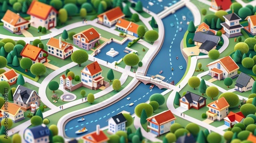 Colorful miniature toy town with winding river, houses, and green trees. Captures the charm and detail of an idyllic neighborhood model.