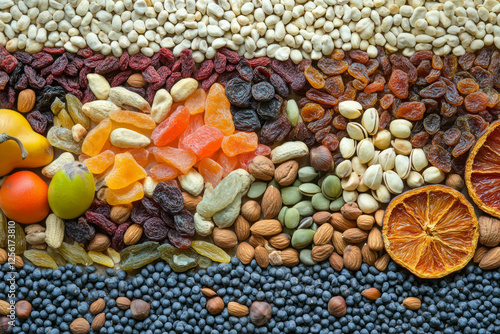 Colorful mix of nuts and dried fruits arranged in a vibrant display for snacking