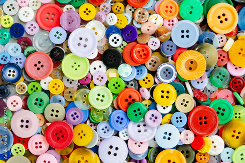Colorful mixed sewing buttons background. Top view