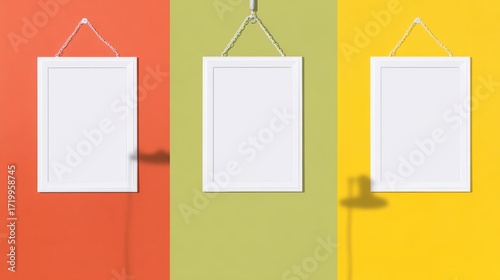 Colorful Mockup of White Frames Hanging on Vibrant Walls in Orange, Green, and Yellow