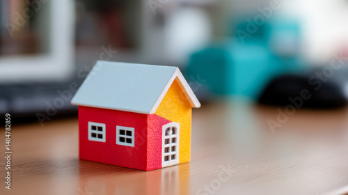 Colorful model house on wooden table during indoor workspace setup