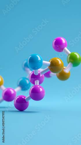 Colorful molecular structure model floating against a blue background in a science concept.