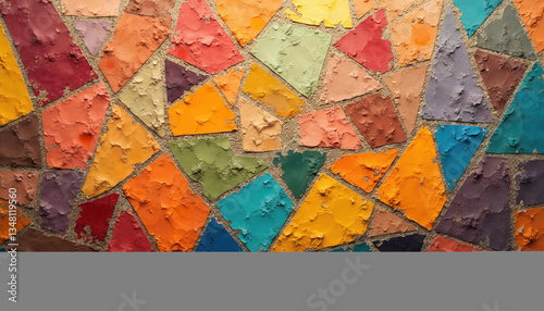 Colorful mosaic background. Irregular geometric shapes create vibrant pattern. Abstract art tile surface. Decorative home design element, modern interior exterior wall decor.