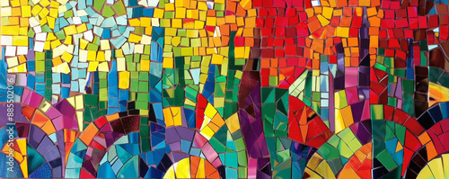 Colorful mosaic with an abstract cityscape in bright hues, creating a vibrant and imaginative urban scene.