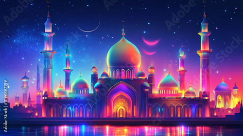 colorful mosque in night with light effect, Ramadan Kareem background with mosque with glowing neon lights, Mosque architecture building with neon lights glowing background.