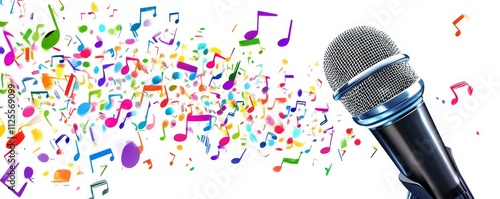 Colorful music notes cascading around a microphone, expressive performance concept