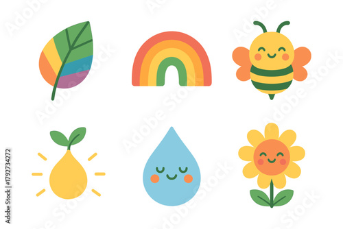 Colorful nature icons: rainbow, bee, leaf, sun, drop, flower