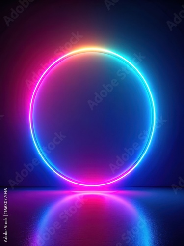Colorful neon circle surrounded by soft glow emitting from all sides in dark space