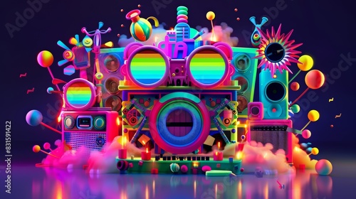 Colorful, neon-lit abstract 3D art installation with various futuristic gadgets and vibrant decorations against a dark background, creating a playful atmosphere.