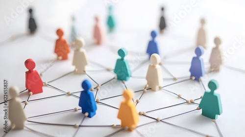 Colorful Network of Wooden Figures Interconnected Representing Social Connections and Teamwork