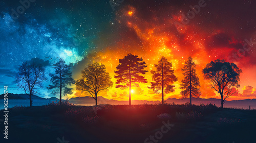 Colorful night sky with milky way shining over trees on horizon
