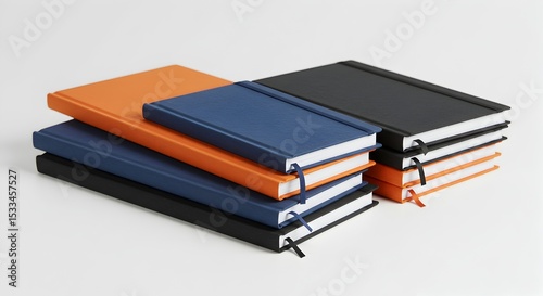 Colorful notebooks stacked together, with sleek office tools and accessories on a modern workspace desk.