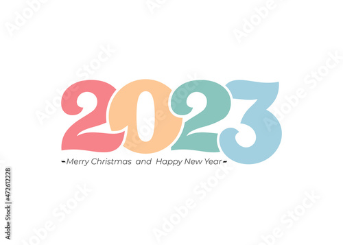Colorful numbers 2023 for poster, brochure, site, banner, ticket. Vector numbers and handwritten letters. Christmas symbols for your design. Illustration with labels. Happy new year 2023.