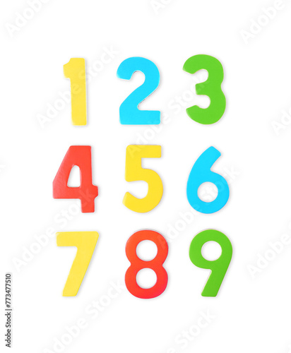 Colorful numbers on white background, top view