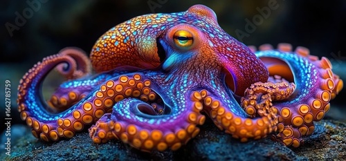 Colorful octopus resting on a rock showing vibrant orange, blue, and purple hues with detailed textured skin and suction cups under soft lighting