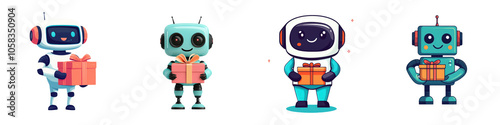 Colorful of Cute and Friendly Cartoon Cyborg Characters Holding Gifts and Presents in a Futuristic Digital Technology Setting