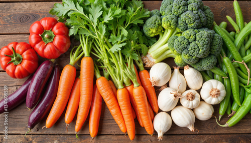 Colorful organic vegetables arranged on rustic table, farm freshness