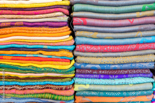 Colorful oriental material in souvenir shop in tourist market of