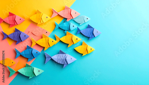 Colorful origami fish arranged against a vibrant background, showcasing creativity and craftsmanship in a playful design