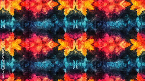 Colorful ornamental tie dye pattern on black background featuring a watercolor effect ideal for modern textile design