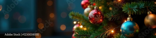 Colorful ornaments and fairy lights decorate a Christmas tree, twinkling lights, glowing accents, evergreen tree