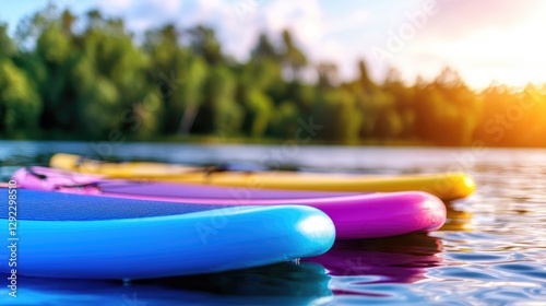 Colorful paddleboards floating on calm lake at sunset, nature background; summer leisure