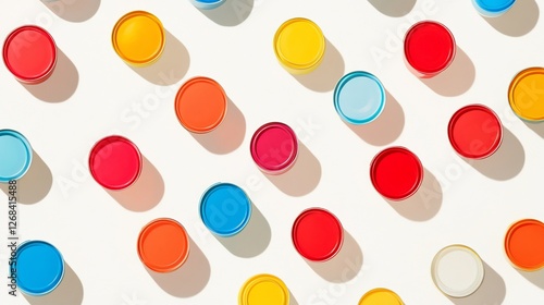 Colorful paint cans arranged in a diagonal pattern on a white background.
