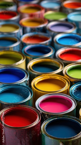 Colorful Paint Cans Arrayed in Rows Overhead Shot Vibrant Palette Art Supplies Crafting Materials