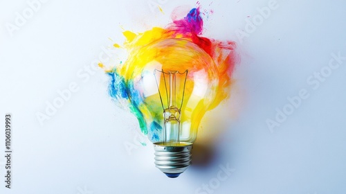 Colorful paint explosion inside a lightbulb on white background.