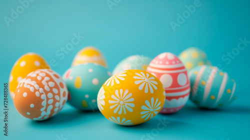 Colorful painted Easter eggs aligned on vibrant blue background, seasonal holiday decorations, Easter concept.