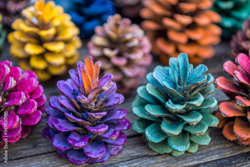 Colorful painted pinecones on wooden surface