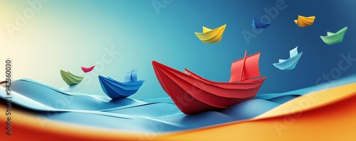Colorful paper boats floating on water with a blue sky background.